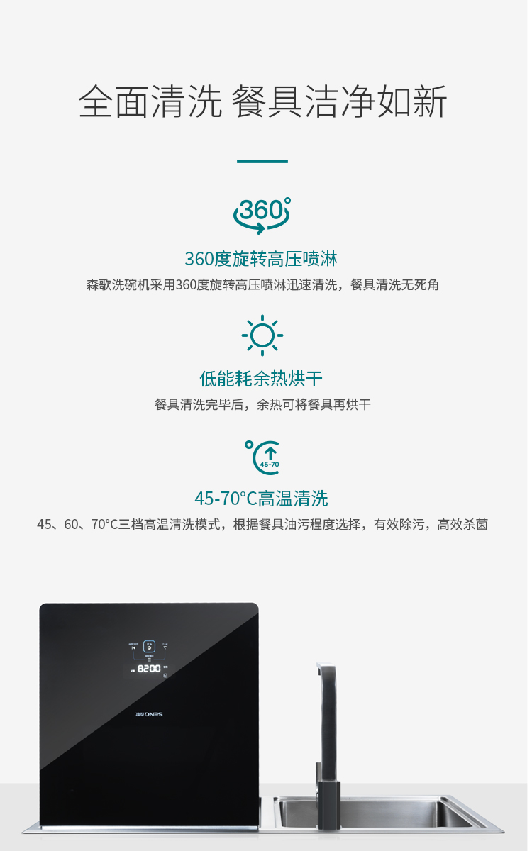 洗碗溫度:輕柔45℃、標(biāo)準(zhǔn)60℃、加強(qiáng)70℃